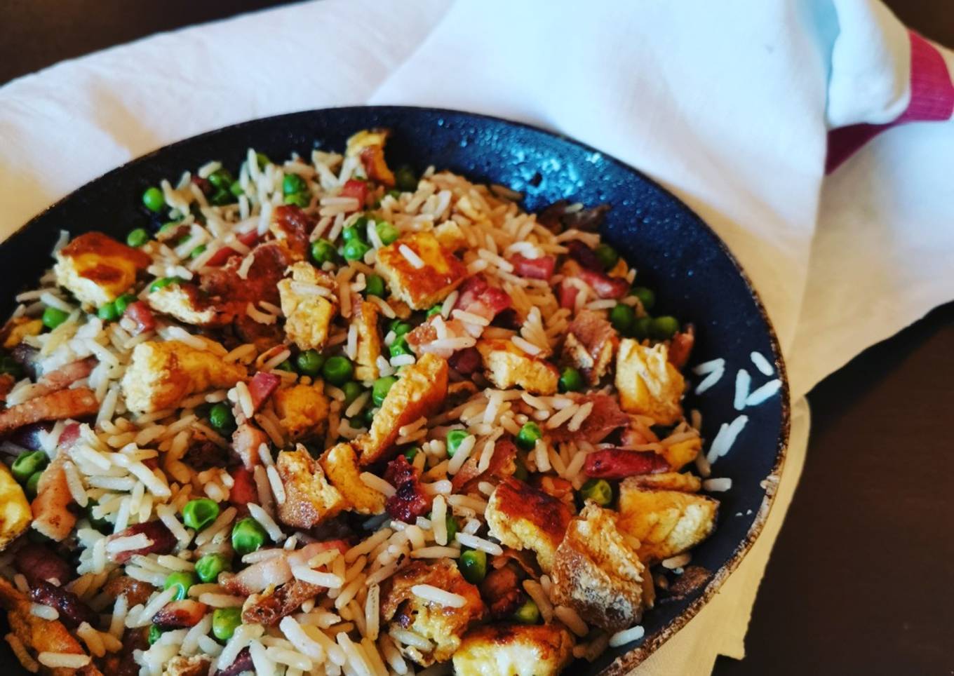 Mettez les lardons à cuire. Lorsqu'ils commencent à être cuits, ajoutez les petits pois et l'omelette en dés. - Ajoutez ensuite le riz cuit et égoutté, et la sauce soja.
