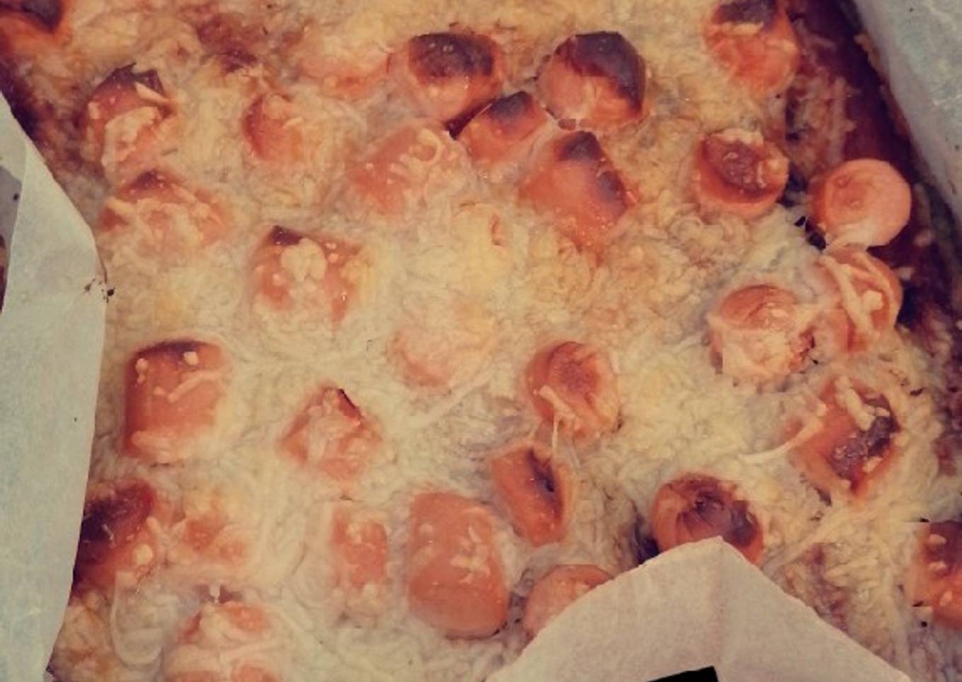 - À la fin de la cuisson.. Garnir la pizza... Mettre de la sauce tomate (j'ai acheté de la sauce à pizza) des knackis et du fromage râpé de chèvre.... Mais après vous pouvez mettre ce que vous voulez.