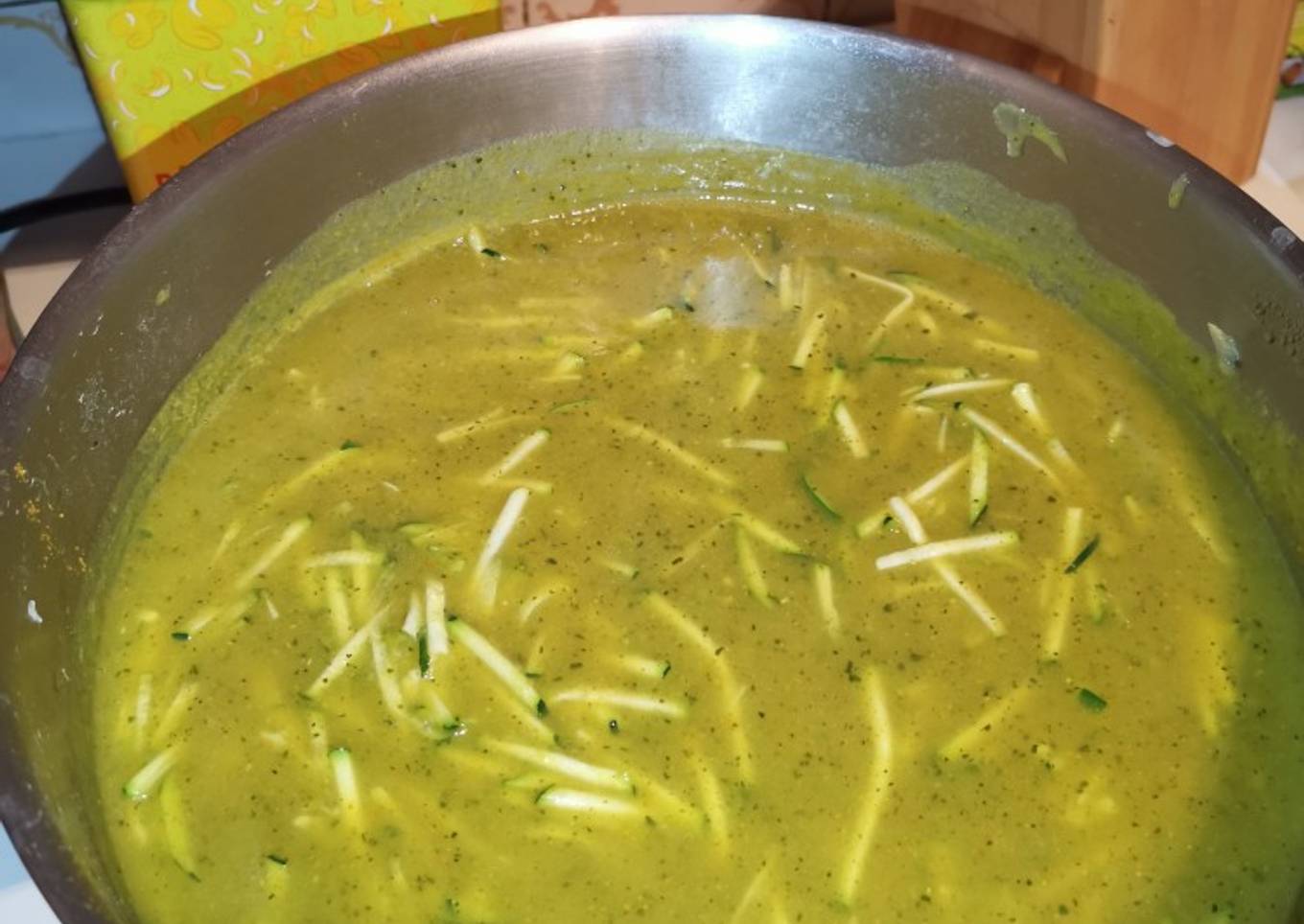 - Laisser cuire tranquillement, mixer. A la fin, prendre la dernière courgette et la tailler en julienne. Mettre la julienne dans la soupe, elle va cuire très vite avec la chaleur de la soupe !