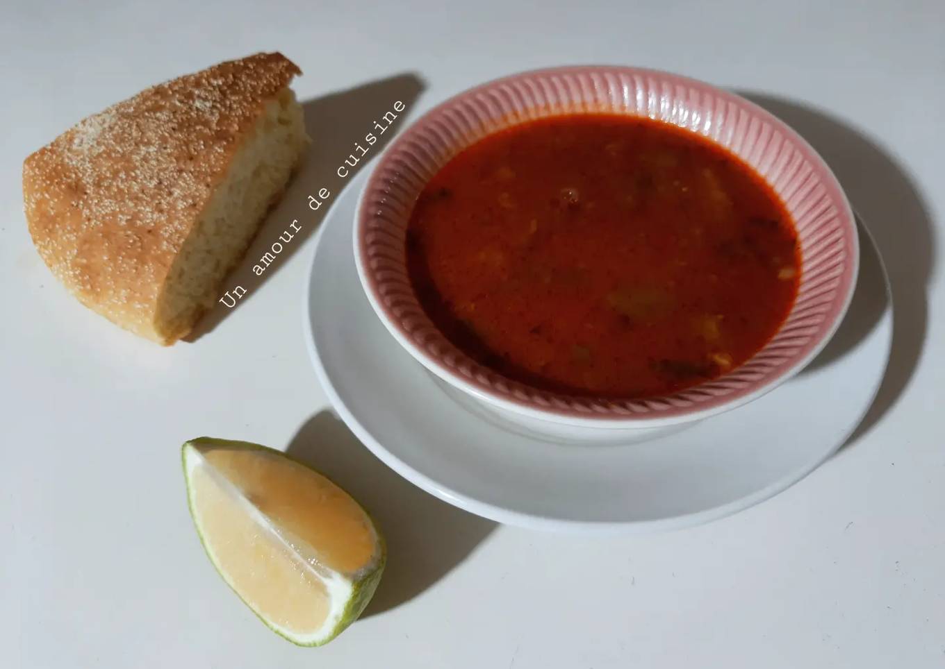 - Servez la soupe chaude accompagnée de pain maison, hrissa et citron.