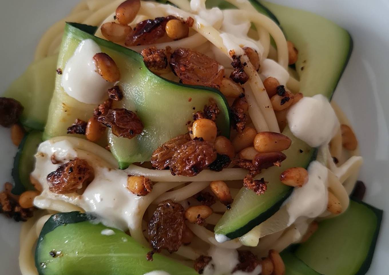 - Dressage : à l'aide d'une pince, faites un tourbillon de pâtes et ajouter les courgettes de façon harmonieuse. Saupoudrer de la préparation pignons, ail, raisins secs et piment d'espelette. Et pour finir, ajouter la crème au Parmesan