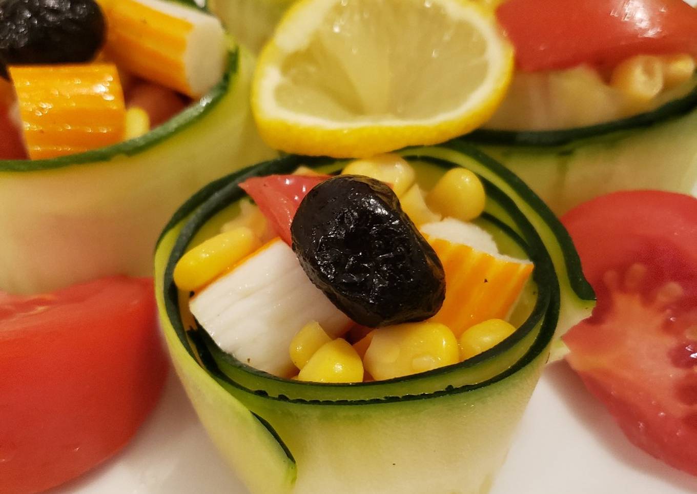 - Installer le mélange dans les roulés de courgette. Décorer avec des olives, des tranches de tomate et une tranche de citron.