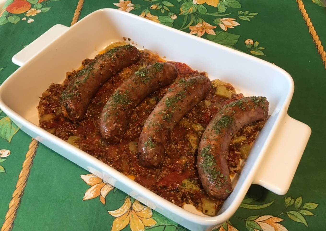 - La sauce doit avoir réduit verser la compotée de tomates et courgettes dans un plat poser les saucisses saupoudrer de persil haché